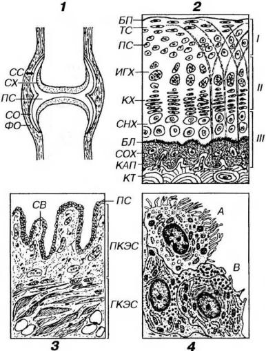 Рис. 12-21. Строение сустава. 1 - общий вид сустава: СС - суставная сумка, ФО - фиброзная оболочка, СО - синовиальная оболочка, СХ - суставной хрящ, ПС - полость сустава. 2 - суставной хрящ: I - поверхностная зона, II - промежуточная (основная) зона, III - базальная зона, КТ - костная ткань, СНХ - слой необызвествленного хряща (гипертрофированных хондроцитов), СОХ - слой обызвествленного хряща, БЛ - базофильная линия (фронт минерализации), КАП - капилляры, КХ - колонки хондроцитов, ИГХ - изогенные группы хондроцитов, ПС - переходный слой, ТС - тангенциальный слой, БП - бесклеточная пластинка. Ход коллагеновых волокон показан в правой части рисунка. 3 - синовиальная оболочка: СВ - синовиальные ворсинки, ГКЭС - глубокий коллагеново-эластический слой, ПКЭС - поверхностный коллагеновоэластический слой, ПС - покровный слой. 4 - синовиоциты А - А-клетки (макрофагальные синовиоциты), В - В-клетки (фибробластоподобные синовиоциты).