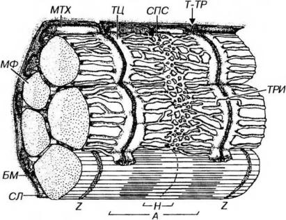 Рис. 13-8. Саркотубулярная система волокна скелетной (соматической) мышечной ткани. Саркотубулярная система включает саркоплазматическую сеть (СПС) и поперечные, или Т-трубочки (Т-ТР). СПС окружает каждый саркомер миофибриллы; ее трубочки сливаются, образуя пары плоских терминальных цистерн (ТЦ). Т-ТР представляют собой впячивания сарколеммы (С/1), отходящие от нее под прямым углом и проникающие в промежуток между двумя ТЦ, в совокупности с которыми они формируют триады (ТРИ). МФ - миофибриллы. Обозначения компонентов саркомера - те же, что на рис.