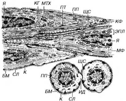 Рис. 13-15. Ультраструктурная организация гладких миоцитов. Ядро (Я) располагается в центре клетки и окружено эндоплазмой (ЭПЛ) - участком цитоплазмы, содержащим органеллы общего значения - митохондрии (МТХ), комплекс Гольджи (КГ), цистерны грЭПС. Периферическая часть цитоплазмы (эктоплазма) занята миофиламентами (МФ), связанными с плотными тельцами (ПТ) и плотными пластинками (ПП). Базальная мембрана (БМ) прилежит к сарколемме (СЛ), с которой связаны многочисленные кавеолы (К) В области углублений СЛ по краям миоцита к ней прикреплены коллагеновые фибриллы (КФ). Соседние миоциты образуют интердигитации (ИД) и щелевые соединения