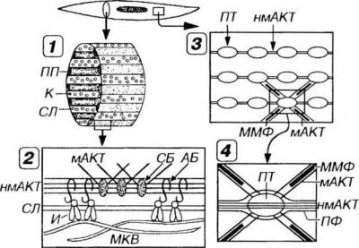 Рис 13-16. Взаимосвязь элементов цитоскелета и сократительного аппарата гладкого миоцита. 1 - плотные пластинки (ПП) в виде "ребер” идут параллельно друг другу по внутренней поверхности сарколеммы (СЛ) вдоль длинной оси миоцита. Кавеолы (К) располагаются в зонах между ПП. 2 - ПП включает периферический и глубокий слои. Первый прилежит к СЛ и образован филаментами немышечного актина (нмАКТ), связанными с трансмембранными белками интегринами (И) посредством комплекса адгезивных белков (АБ). В глубоком слое филаменты мышечного актина (мАКТ) прикреплены к молекулам нмАКТ связующими белками (СБ). МКВ - межклеточное вещество (фибриллы, взаимодействующие с И). 3 - плотные тельца (ПТ) посредством филаментов нмАКТ соединены друг с другом в цепочки, продольно лежащие в саркоплазме; 4 - пучки филаментов мАКТ проникают в ПТ под углом (на фрагменте "З" изображены частично), а промежуточные филаменты (ПФ) окружают их по периферии. Сокращение клетки обеспечивается взаимодействием актиновых и расположенных между ними миозиновых миофпламентов (ММФ) в соответствии с моделью скользящих нитей.
