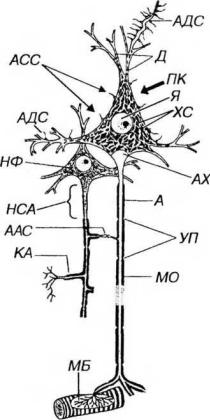 Рис. 14-2. Строение мультиполярного нейрона (по Rohen J.W., Lutjen-Drecoll E. 1982). ПК - перикарион, Я - ядро с ядрышком, ХС - хроматофильная субстанция, НФ - нейрофибриллы (агрегаты элементов цитосклета), Д - дендриты. А - аксон, НСА - начальный сегмент аксона, АХ - аксонный холмик, КА - коллатерали аксона, МО - миелиновая оболочка, УП - узловые перехваты, МБ - моторная бляшка (двигательное нервное окончание на волокне поперечнополосатой мышцы). Синапсы (С): АДС - аксо-дендритический, АСС - аксо-соматический, ААС - аксо-аксональный.