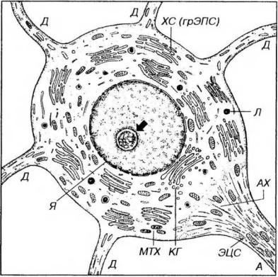 Рис. 14-3. Ультраструктурная организация нейрона. Я - ядро (ядрышко показано стрелкой), ХС - хроматофильная субстанция, ЭЦС - элементы цитоскелета (нейротрубочки, нейрофиламенты), МТХ - митохондрии, КГ - комплекс Гольджи, Л -лизосомы, Д - дендриты, А - аксон, АХ - аксонный холмик.