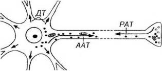 Рис. 14-4. Процессы транспорта в нейроне. AAT - антероградный аксонный транспорт (из тела нейрона по аксону) подразделяется на медленный (скорость - 1-5 мм/сут.) и быстрый (100-500 мм/сут.). PAT - ретроградный аксонный транспорт (из аксона в тело нейрона) осуществляется со скоростью 100-200 мм/сут. ДТ - дендритный транспорт (из тела клетки по дендритам) происходит со скоростью около 70 мм/сут.