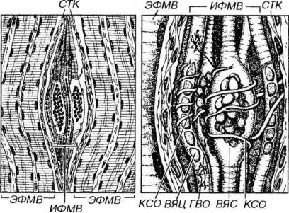 Рис. 14-15. Нервно-мышечное веретено. 1 - общий вид веретена, располагающегося между экстрафузальными мышечными волокнами (ЭФМВ) и образованного интрафузальными мышечными волокнами (ИФМВ), которые окружены соединительнотканной капсулой (СТК) 2 - детали строения веретена, содержащего два вида ИФМВ: волокна с ядерной сумкой (ВЯС) и волокна с ядерной цепочкой (ВЯЦ). Чувствительные нервные волокна образуют кольцеспиральные окончания (КСО) на центральной части ИФМВ обоих типов и гроздьевидные окончания (ГВО) у краев ВЯЦ. Нервно-мышечное веретено содержит также двигательные нервные волокна и образованные ими нервномышечные синапсы по краям ИФМВ (не показаны).