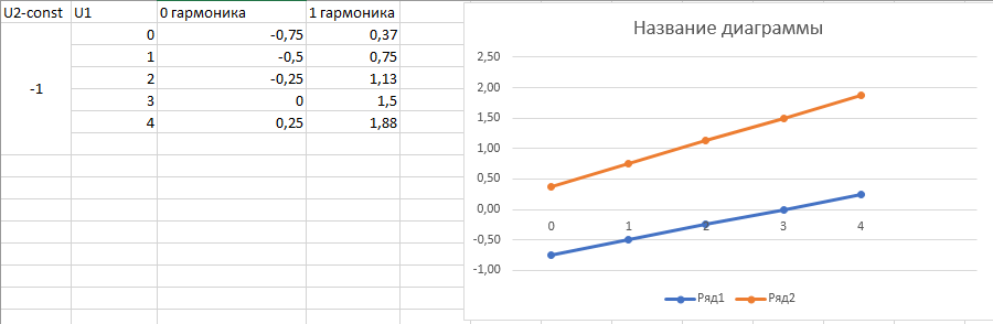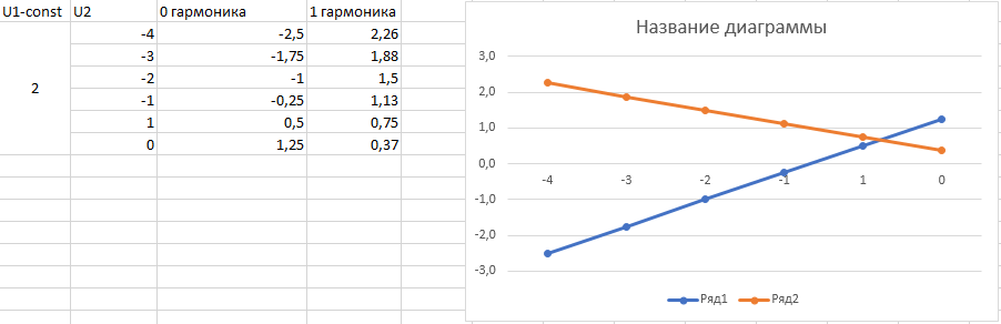 Вывод: При уменьшении напряжения отрицательной U2 части сигнала, при постоянной положительной U1 – 0 гармоника уменьшается пропорционально, 1 гармоника увеличивается пропорционально. При уменьшении напряжения положительной U1 части сигнала, при постоянной отрицательной U2 – одновременно изменяется прямо пропорционально как 0 гармоника, так и 1 гармоника.