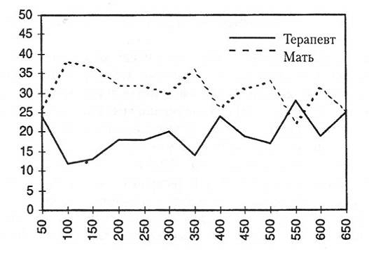 Рисунок 1. Динамика речевых высказываний пациента и терапевта на первом сеансе краткосрочной материнско-детской терапии