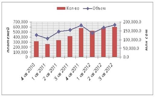 По итогам работы за 3-й квартал 2012 г. общий объем межбанковских платежей составил 182 418,3 млн. сом. Данный показатель по сравнению с: