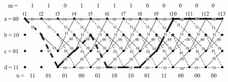 По решетчатой диаграмме сверточного кодера определим последовательность кодовых символов (КС) u на выходе кодера при условии m = 110111100