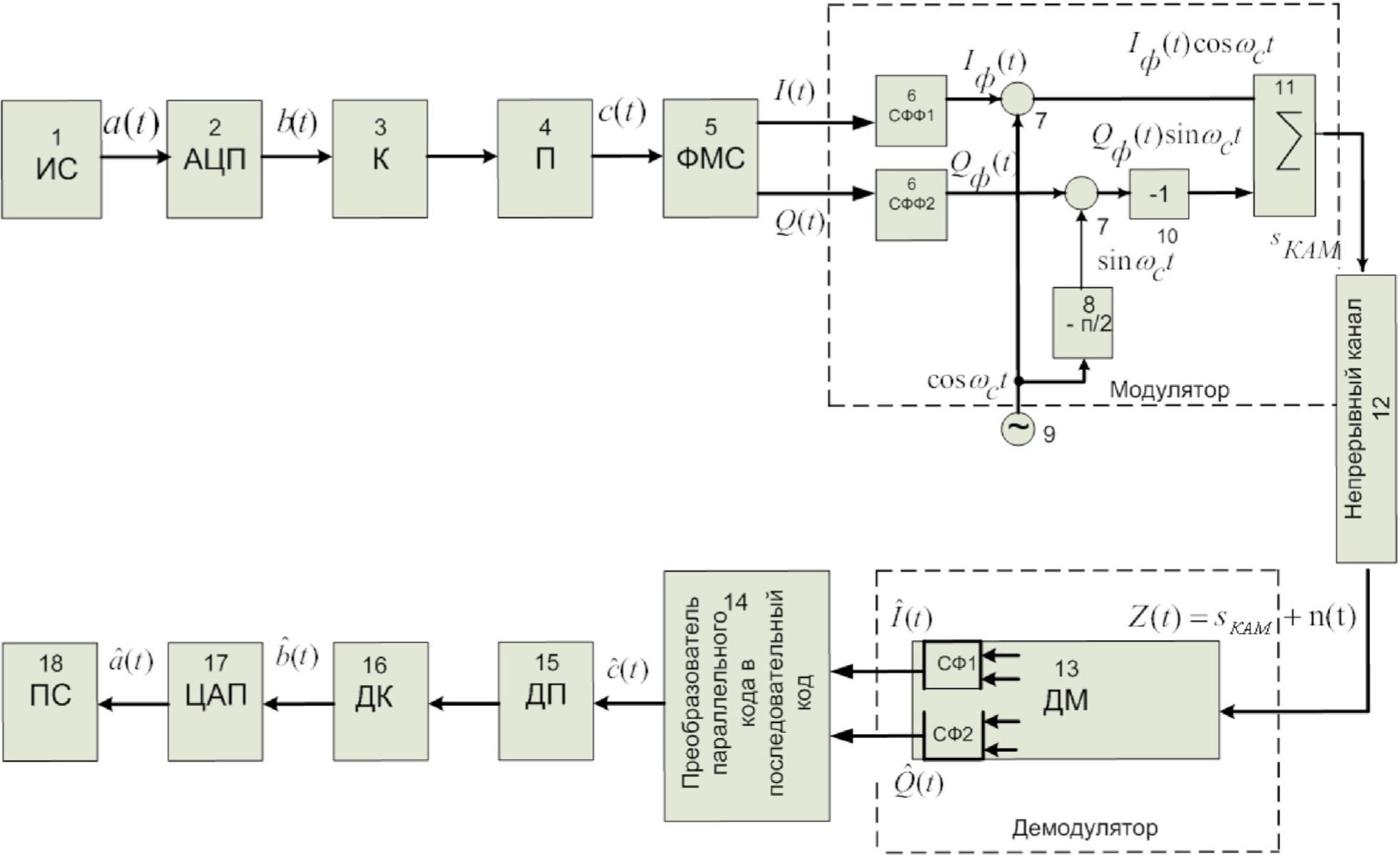 – аналого-цифровой преобразователь (АЦП) преобразует аналоговый сигнал от источника сообщения в последовательность его двоичных цифровых отсчётов;