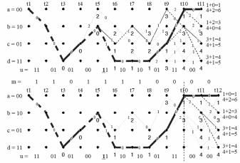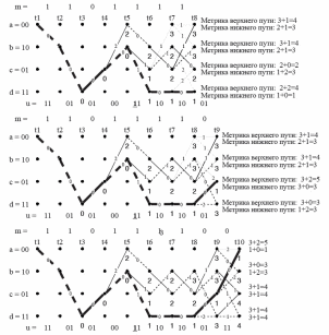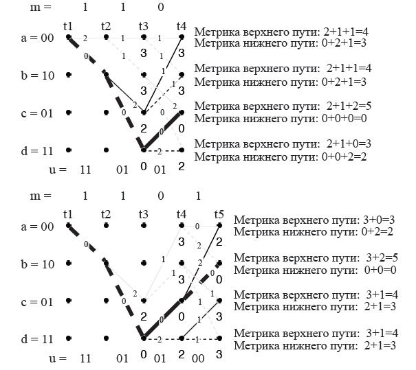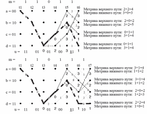 На вход декодера поступает последовательность кодовыхсимволов z = 11 01 01 00 0∗1 10 10 01 11 00 00, где звездочкой отмечен бит с ошибкой. Рассмотрим работу декодера на рисунках 22, 23 на следующих страницах. Под точками на диаграмме будем писать метрику пути, приводящего в эту точку. Это делается для упрощения расчетов. Начиная с десятого такта не будем отдельно подписывать, где метрика для верхнего и нижнего пути. Условимся, что верхнему пути соответствует верхний расчет, нижнему – нижний.