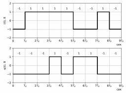 4. На четырех символьных интервалах длительностью TS нарисовать сигналы на выходах РУ1 и РУ2 демодулятора, соответствующие сигналам на выходе блока ФМС (рис. 20) и график сигнала на выходе преобразователя кода в виде соответствующей после- довательности прямоугольных импульсов на входе блока ФМС (рис. 21).