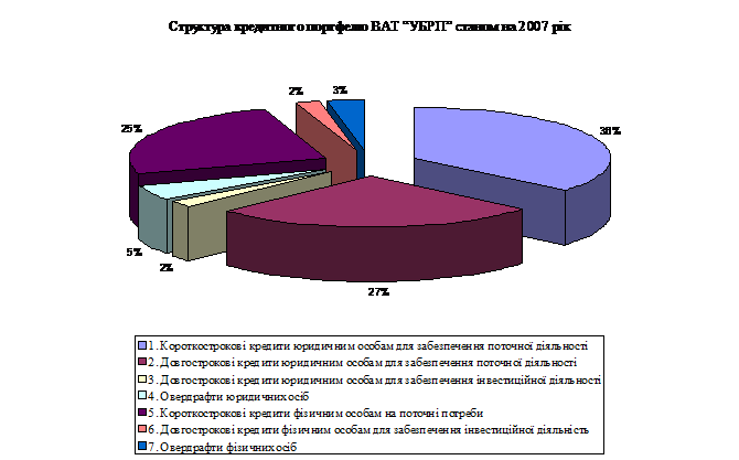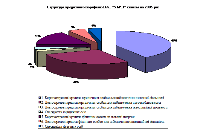Таким чином в 2004 році найбільшу питому вагу займали короткострокові кредити юридичним особам для забезпечення поточної діяльності - 41 % та довгострокові кредити юридичним особам для забезпечення поточної діяльності. В 2005 році довгострокові кредити юридичним особам для забезпечення поточної діяльності, займають найбільшу питому вагу - 44,76 %, Короткострокові кредити юридичним особам для забезпечення поточної діяльності - 29,99 %