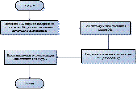 Весовой коэффициент компетенции Wci - это некий процент компетенции, который, по мнению преподавателя, может быть усвоен студентом в результате прослушивания конкретной темы. Поскольку курс сбалансирован, т.е. после его прослушивания студент должен в полной мере обладать каждой из приписанных компетенций (происходит 100% покрытие), необходимо преобразование весов компетенций уже относительно всего курса в целом, а не отдельной темы. На Рис. 7 представлен алгоритм вычисления сбалансированных весовых коэффициентов компетенций.