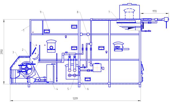 1– посадочная камера; 2 – цепной конвейер; 3 – каркас; 4 – аварийные люки; 5 – газовая разводка; 6 – теплоутилизатор; 7 – парогенераторы;