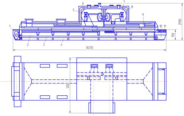 1– приводная станция; 2, 4 – центробежные вентиляторы; 3, 5 – топочные секции; 6 – пароувлажнительное устройство; 7 – сетка; 8 – натяжная станция; 9 – восемь секций; 10 – каналы-газоходы; 11 – пекарная камера