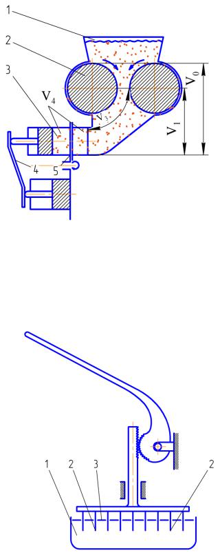 Рис. 4. Принципиальная схема тестоделительной машины с валковым нагнетателем и прокатывающим устройством без делительной головки: 1 – приемная воронка; 2 – нагнетающие валки; 3 – формующий барабан; 4 – реборда барабана; 5 – отсекающий поворотный нож