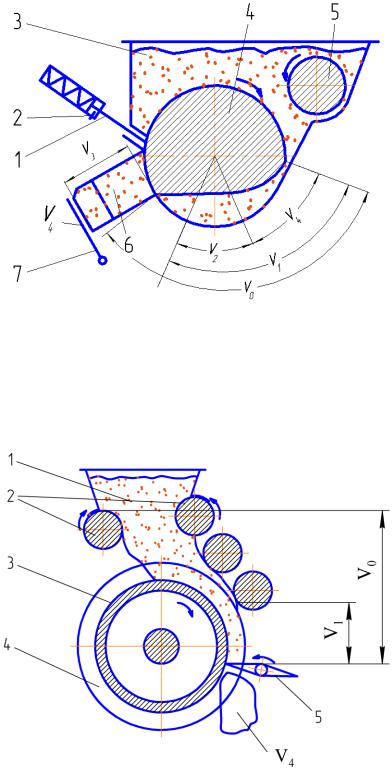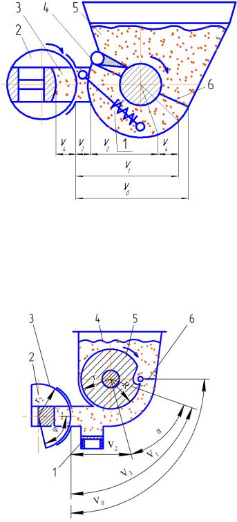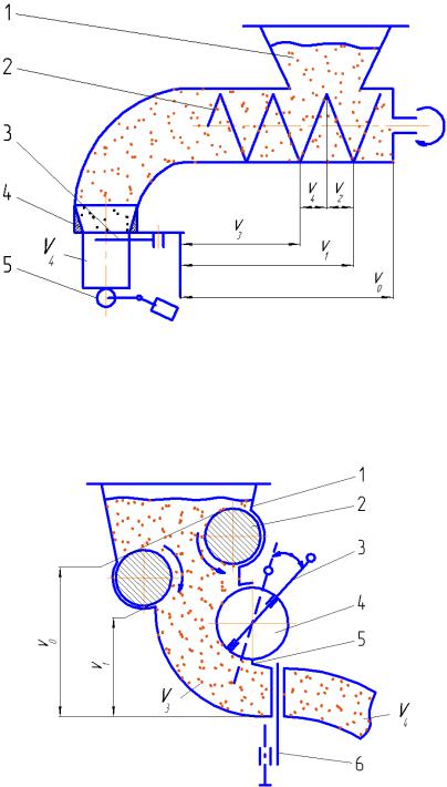 1– подпружиненная отсекающая заслонка; 2 – ограничитель хода заслонки; 3 – приемная воронка; 4 – ротор; 5 – валок; 6 – буферная камера;
