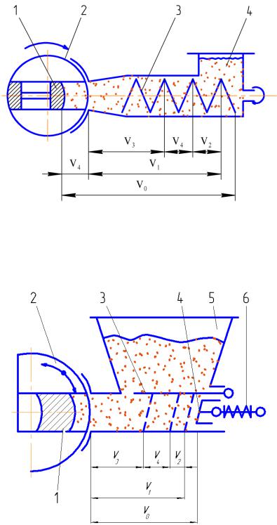 1 – спаренные плавающие мерные поршни; 2 – делительная головка; 3 – нагнетающий шнек; 4 – приемная воронка