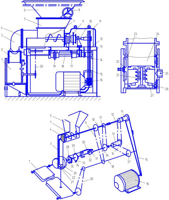 Регулирование массы кусков теста производится изменением объема мерного кармана путем сближения или удаления половинок поршня с помощью винта 21 и пружины 27. Производительность тестоделителя можно менять с помощью сменной звездочки 37. Машина приводится в движение от электродвигателя 16. Движение клиноременной передачей 15 передается на блок 11 шкива и звездочки, полый вал которых установлен на шариковых подшипниках на главном валу 10. Цепная передача 12 передает движение на блок звездочек 13, от которого цепной передачей 14 вращается вал 18. От этого вала цепной передачей 9 приводится во вращение главный вал 10 с нагнетательным шнеком 7. От вала 18 цепной передачей 20 приводится в движение приемный ленточный транспортер 1. От главного вала цепной передачей 17 вращение непрерывно передается ведущему валу 36, а от него – делительному барабану.