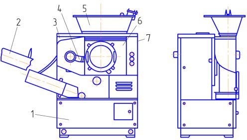 1 – основание; 2 – транспортер; 3 – станина; 4 – делительная головка; 5 – приемный бункер; 6 – тестовая камера; 7 – щит управления