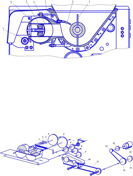 1 – лопасть; 2 – заслонка; 3 – козырек; 4 – мерный карман; 5 – поршень; 6 – раздвигающий механизм; 7 – валик