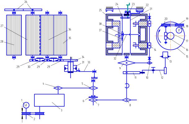 27, 28, 35, 36 – нагнетательные валки с ребордами; 31 – обгонная муфта; 32 – винт раздвигания поршней; 33 – кривошипно-шатунный механизм; 37, 38 – винтовые зубчатые колеса