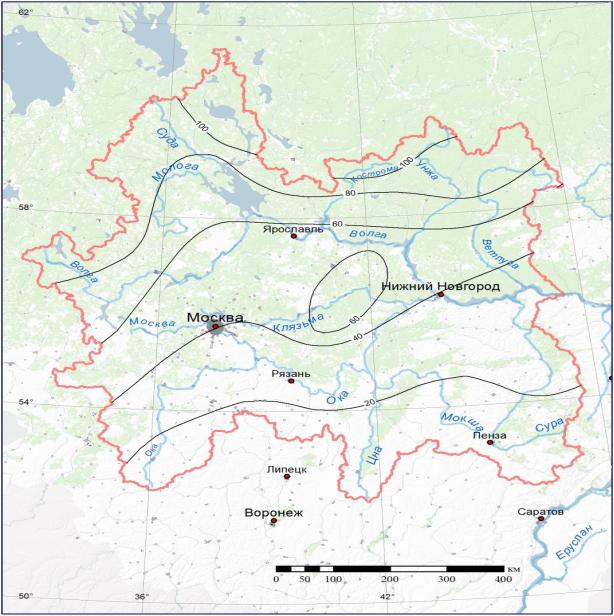 Рисунок 7.2 – Максимальный слой дождевых паводков вероятностью превышения 1 % рек бассейна Верхней Волги, мм