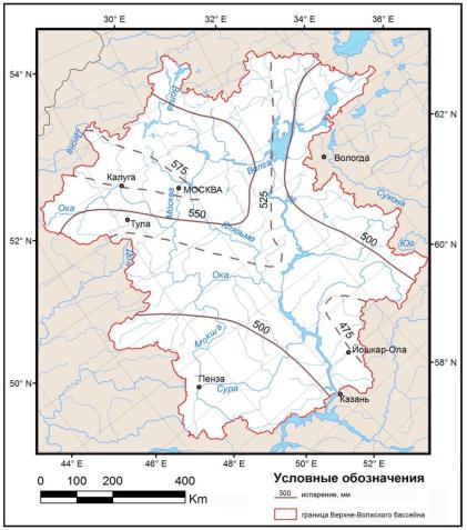 (525–550 мм) по сравнению с другими районами бассейна (рисунок 1.2). К востоку величина испарения резко сокращается и в бассейне Ветлуги достигает 475 мм и менее. В северной, южной и юго-восточной части региона годовые суммы испарения приближаются к 500 мм.