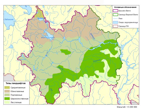 В бассейне Верхней Волги представлены три типа основных ландшафтных зон: таежная,