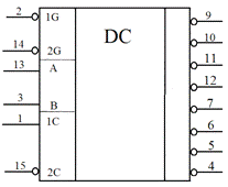 Мікросхема має два адресних входи «А» та «В». Вони служать для одночасного управління вихідними станами дешифраторів. У кожному дешифраторі є окремий стробуючий вхід «1G» та «2G».