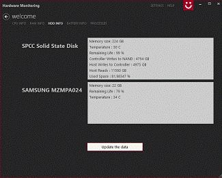 В окне представлены данные о жестких дисках: их объем, температура, загрузка и т.д. (рис. 3). Показатели обновляются по клику на кнопку "Update the data”.