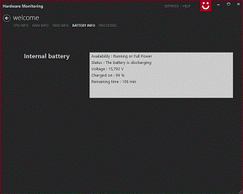 В окне представлены текущие данные о батарее: статус, доступность, напряжение, зарядка, оставшееся время до полной разрядки (рис.4). Данные обновляются каждые пять секунд.