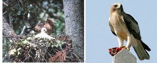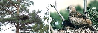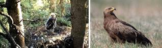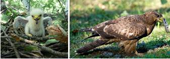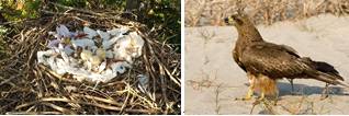Рис. 14. Внешний вид взрослой особи и птенца малого подорлика. Строение его гнезда.