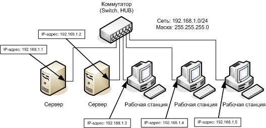 На рисунке 1.1 приведен пример простейшей схемы локальной сети, причем не важно под какой "программной средой" (Windows, Linux, MAC и т.п.).