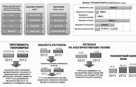 Загальні обсяги теплопостачання по Україні склали 89 млн. Гкал., у т.ч. населенню - 51,9 млн. Гкал, на комунально-побутові потреби - 20,6 млн. Гкал, на виробничі потреби - 10,3 млн. Гкал, іншому підприємству - 6,2 млн. Гкал. Витрати умовного палива на відпуск теплової енергії у 2013 році становили 15094,7 тис. тонн.
