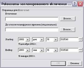9. У полі протягом часу за розкладом (During| the| scheduled| time|) введіть URL| адреса сторінки, що містить інформацію про знижки. Для цього можете скористатися діалоговим вікном Поточний веб-вузол (Current| Web|), що відкривається при натисненні кнопки Огляд (Browse|), і вибрати необхідну сторінку. 10. У полі до і після часу за розкладом (Before| and| after| the| scheduled| time|) введіть URL| адреса сторінки, інформація з якої відображатиметься на сторінці поза часом, заданим розкладом. Для введення адреси можете також скористатися діалоговим вікном Поточний веб-вузол, що відкривається при натисненні кнопки Огляд. 11. За умовчанням в полях області Початок (Starting|) задані поточна дата і час, а в області Закінчення (Ending|) — дата і час, великі поточною на місяць. Скоректуйте інформацію в цих полях, вказавши часовий період дії розкладу. 12. Натисніть кнопку ОК для закриття діалогового вікна Властивості включеної сторінки з розкладом.