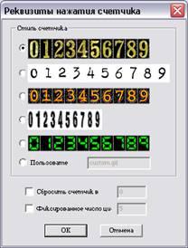 6. Використовуючи опції області Стиль лічильника (Counter| Style|), можна змінити стиль оформлення лічильника, встановлений у вікні Вставка компоненту веб-вузла (Insert| Web| Component|). Вибрана опція Інший малюнок (Custom| Picture|) дозволяє використовувати стиль, розроблений користувачем. 7. Встановите прапорець Скинути лічильник (Reset| counter| to|), якщо хочете задати інший відлік числа відвідувачів. Потім в поле, розташоване праворуч від прапорця, введіть значення, з якого необхідно почати відлік. 8. Для зміни розрядності лічильника, заданою за умовчанням програмою FrontPage|, встановите прапорець Число розрядів (Fixed| number| of| digits|) і введіть в розташоване справа поле необхідне значення. 9. Натисніть кнопку ОК для закриття діалогового вікна Властивості лічильників відвідин.