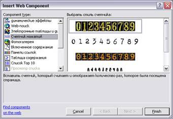 1. Відкрийте Web-страницу|, на якій хочете розмістити даний компонент. 2. Встановите курсор в місце передбачуваного розміщення об'єкту Лічильник відвідин. 3. У меню Вставка (Insert|) виберіть команду Веб-сервер-компонент (Web| Component|). Відкривається діалогове вікно Вставка компоненту веб-вузла (Insert| Web| Component|) (див. мал. 21.1). 4. Із списку Тип компоненту (Component| type|) виберіть значення Лічильник відвідин, при цьому в правій області вікна з'являється список Виберіть стиль лічильника (Choose| а counter| style|) (мал. 21.6).