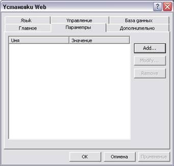 При створенні Web-узла| за допомогою майстра список змінних конфігурації формується на основі відповідей на питання, що задаються майстром. Їх значення можна подивитися і відредагувати на вкладці Параметри (Parameters|) діалогового окнаНастройка| веб-вузла (Web| Settings|) (мал. 21.4). Для його відкриття в меню Сервіс(Tools|) виберіть команду Настройка веб-вузла (Web| Settings|). При розробці Web-узла| без використання майстра список змінних конфігурації ви повинні сформувати самостійно.