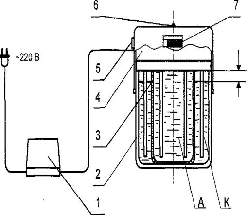 Керамічний стакан (поз. 3) виконує функцію діафрагми між катодом і анодом. У ньому утворюється аноліт - «мертва» вода.