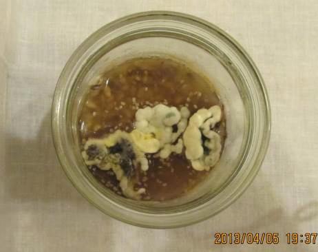 Коментар: у склянці з написом «Дякую» запах став ще більш насиченим, а в склянці з написом «Ти дурень» запах став «гнилим», нестерпним, бридким та «тяжким», збільшились та розрослись грибкові утворення до стінок банки. Цей тиждень спостережень остаточно підтвердив та дав змогу переконатися мені в тому, що слова справді мають енергію (ХАДО) і впливають на все живе в цьому світі. В чому можна дійсно переконатись переглянувши динаміку змін фото.