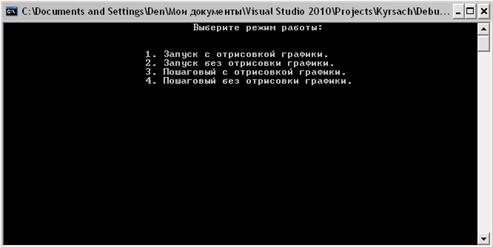 {("cls");<<"\t\t\t\tВыберите режим работы:\n\n\n";<<"\t\t\t1. Запуск с отрисовкой графики.\n";<<"\t\t\t2. Запуск без отрисовки графики.\n";<<"\t\t\t3. Пошаговый с отрисовкой графики.\n";<<"\t\t\t4. Пошаговый без отрисовки графики.\n";(getch())