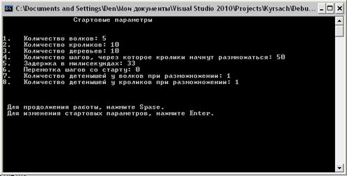 {<<"\t\t Cтартовые параметры\n\n";<<"\n1. Количество волков: "<<colW;<<"\n2. Количество кроликов: "<<colR;<<"\n3. Количество деревьев: "<<colT;<<"\n4. Количество шагов, через которое кролики начнут размножаться: "<<old;<<"\n5. Задержка в милисекундах: "<<delay;<<"\n6. Перемотка шагов со старту: "<<endstep;<<"\n7. Количество детенышей у волков при разможножении: "<<razmW;<<"\n8. Количество детенышей у кроликов при разможножении: "<<razmR;
