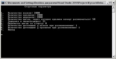 }<<"\n Количество детенышей у кроликов при разможножении: ";>>razmR;<<"\n\n\n";_params();(getch()=='9') return;