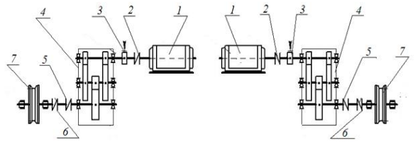 Механізм пересування виконуються у вигляді одноколісних або балансирних візків, що з'єднуються з основою стійок опор або ходових балок, на які попарно спираються дві стійки. На малюнку 1.2 є два когерентно працюючих механізму пересування козлового крана. Каждий з механізмів включає в себе електродвигун 1, з'єднувальну муфту 2 з редуктором 4, та передає рух на провідні колеса 7. Вал приводного колеса з'єднаний з тихохідним валом редуктора проміжним валом 6 і зубчастими муфтами 5. На напівмуфті швидкохідного вала редуктора встановлений гальмо 3. [3]