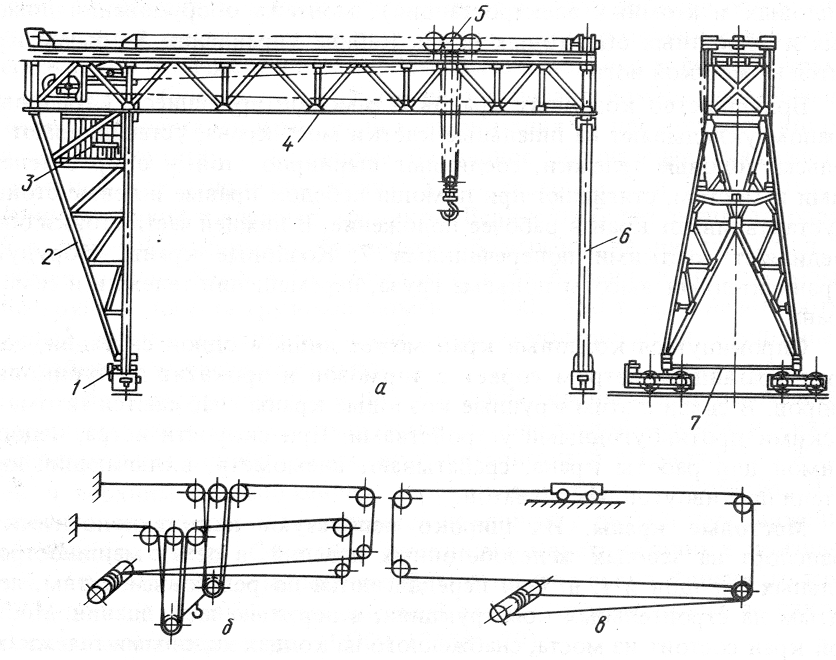 1 — ходові візки; 2, 6 — жорстка і гнучка опори, 3 — кабіна керування, 4 — міст; 5 — вантажний візок; 7— поперечина, б — схема запасовки каната піднімання вантажу; в — схема запасовки каната переміщення візка