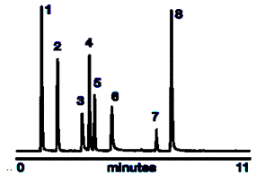 Хроматограмма анализа жирорастворимых витаминов: 1. Витамин А 2. токол 3. y -токоферол 4. a -токоферол (Витамин E) 5. лютеин 6. зеаксантин 7. криптоксантин 8. a -каротин