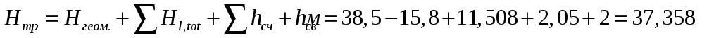 где Hгеом – геометрическая высота подъема воды (разность отметок диктующей точки и отметки земли в точке подключения к городской водопроводной сети); ΣHl,tot – сумма потерь напора на расчетном участке трубопровода, м Σhсч – сумма потерь напора в домовом водомерном узле; hсв – свободный напор у диктующего водонапорного прибора; hсв = 2 м.