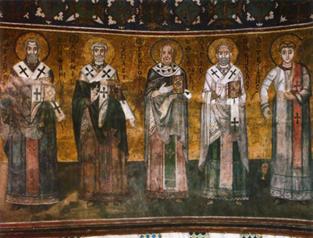 Там, где освещение сильнее, византийские мозаичисты прибегают к светлой гамме холодного тона, а где стены и своды освещаются с помощью отраженного, а не прямого света, там наблюдается подбор насыщенных и теплых цветов. В этом отношении показательна цветовая трактовка фигур святительского чина в Софии Киевской.