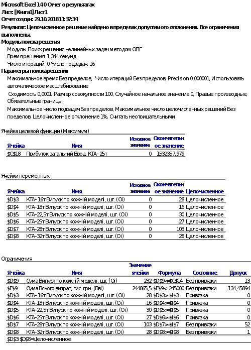 Висновок: з огляду на звіт по результатах видно, що не перевищуючи рівень витрат продукції у розмірі 245 тис. од. та не випускаючи більш ніж 245 тис. од. продукції з урахуванням обмежень на рівень попиту можна одержати максимальний прибуток у розмірі 1532357,98 тис. грн.